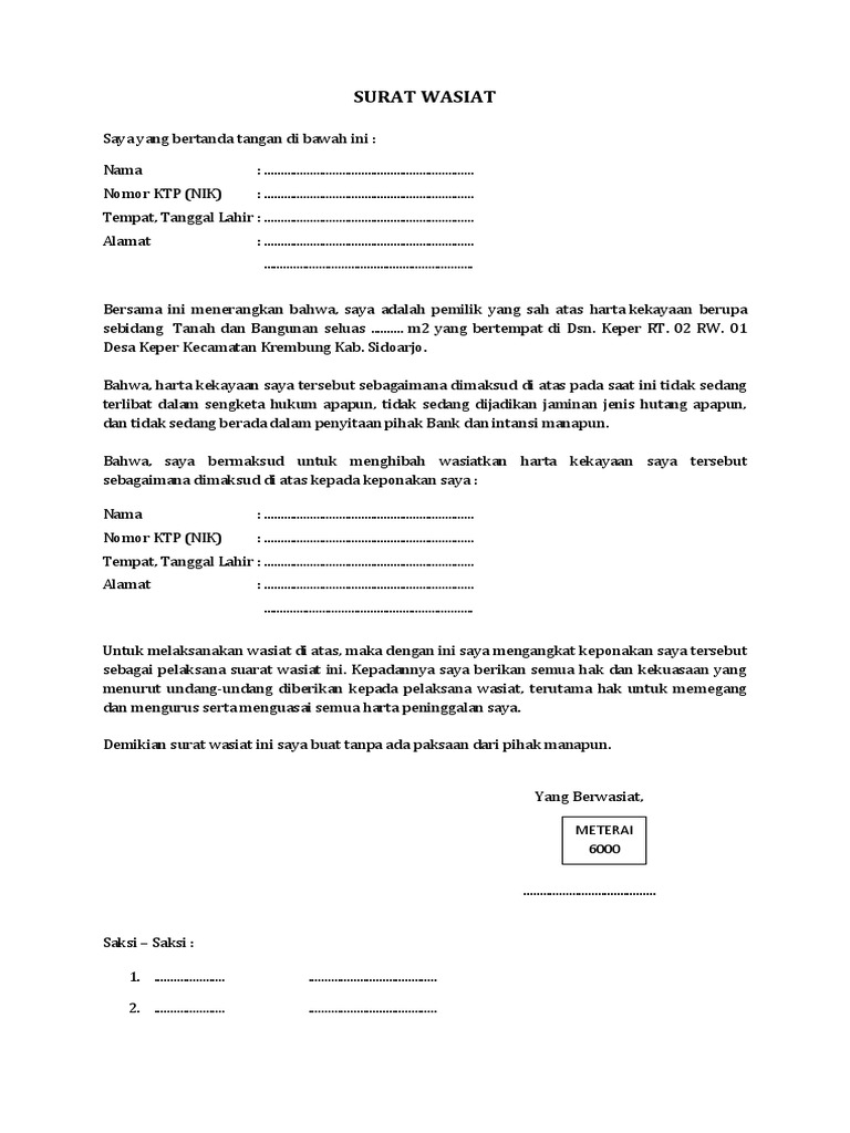 Contoh Surat Wasiat Tanah Untuk Istri Pdf